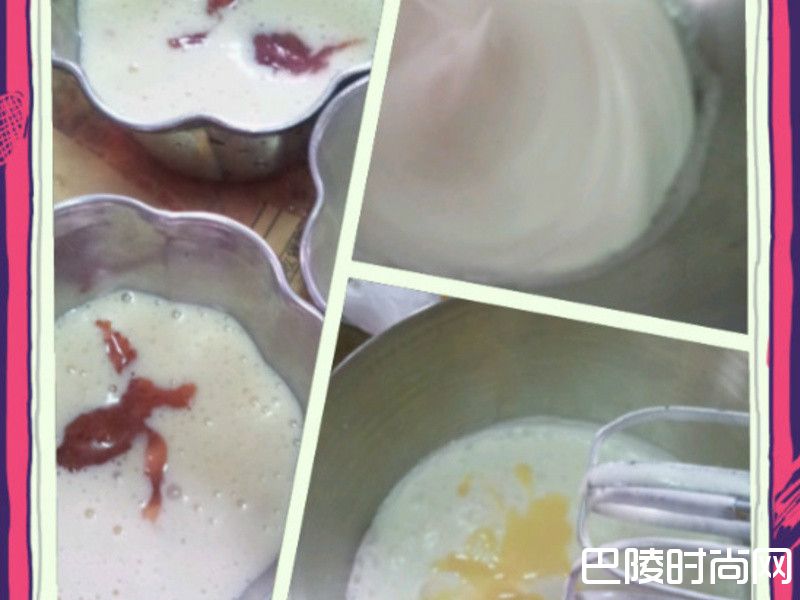 3先倒三分之一入准备好的模型中(记得放烘焙纸避免沾黏)。放入适量已煮好的草莓酱,再倒入蛋糕糊。