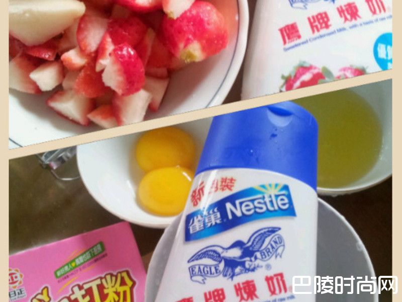 4放电锅蒸约20分钟。起锅放上新鲜草莓及炼乳在蛋糕上装饰即可食用