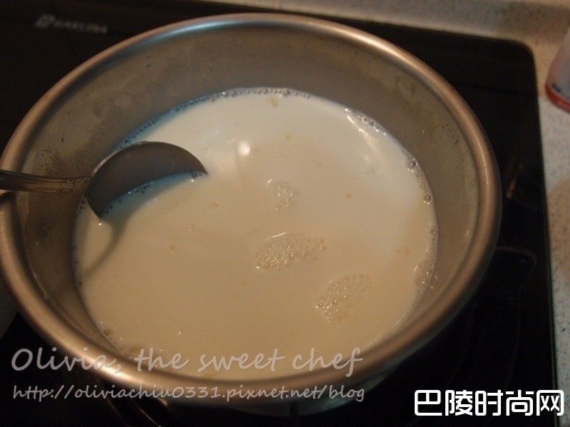 3熄火加入吉利丁拌至融化,加入牛奶100ml和鲜奶油拌匀。