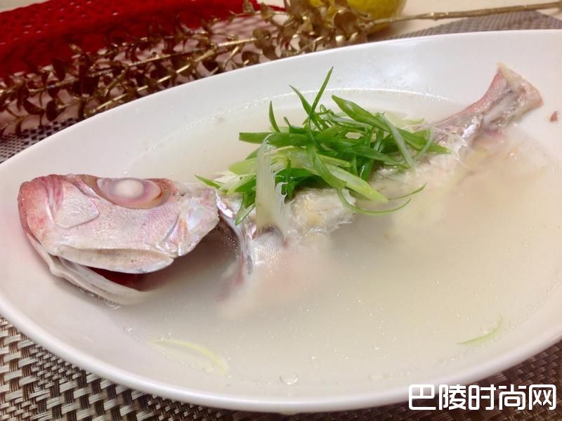 7、取出蒸盘,在鱼头上撒上香葱末,淋入热油即成。