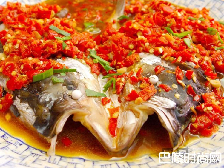 7、将鱼头反放于盘中,涂上剁椒酱,下垫葱姜蒜,上锅笼中火蒸20分钟。
