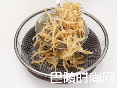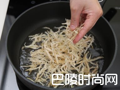 2将3-4汤匙油加入平底锅,放入银鱼炸至呈金黄色