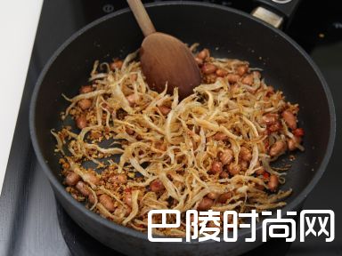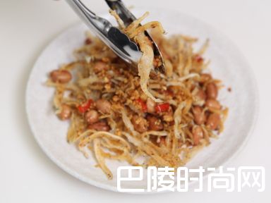 7将银鱼回锅,拌匀,中火炒2分钟直至材料