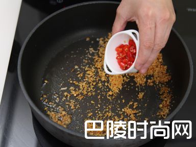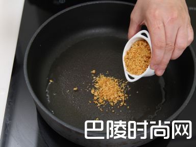 4将平底锅内的油倒剩1/2汤匙,把油烧热,快炒香干蒜