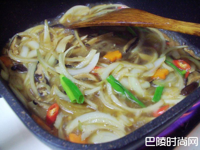 6接着加入所有调味ˊ和酌量的水煮滚ˊ并用玉米粉水或太白粉水勾点薄芡ˊ最后摆入辣椒及葱绿略为拌匀即可。