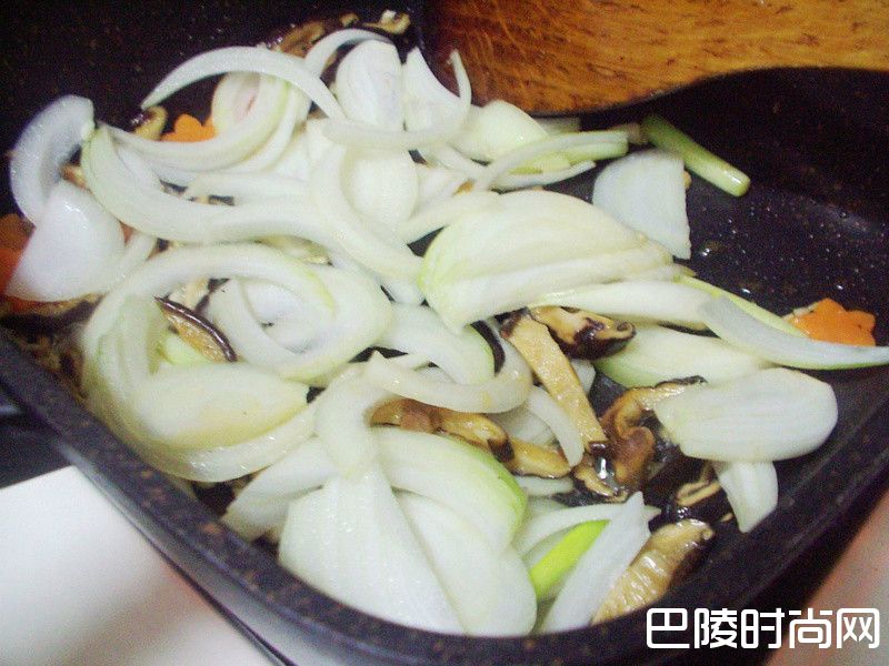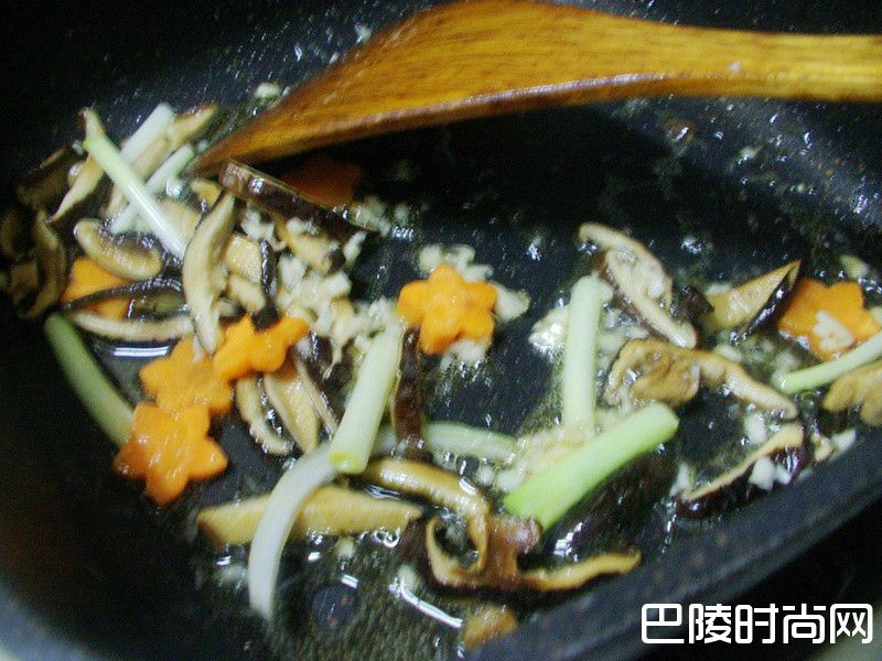 4接着依序爆香蒜末ˊ葱白ˊ和红萝卜