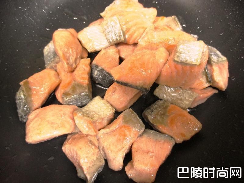 2热锅用油将鲑鱼煎至两面上色后,取出备用。