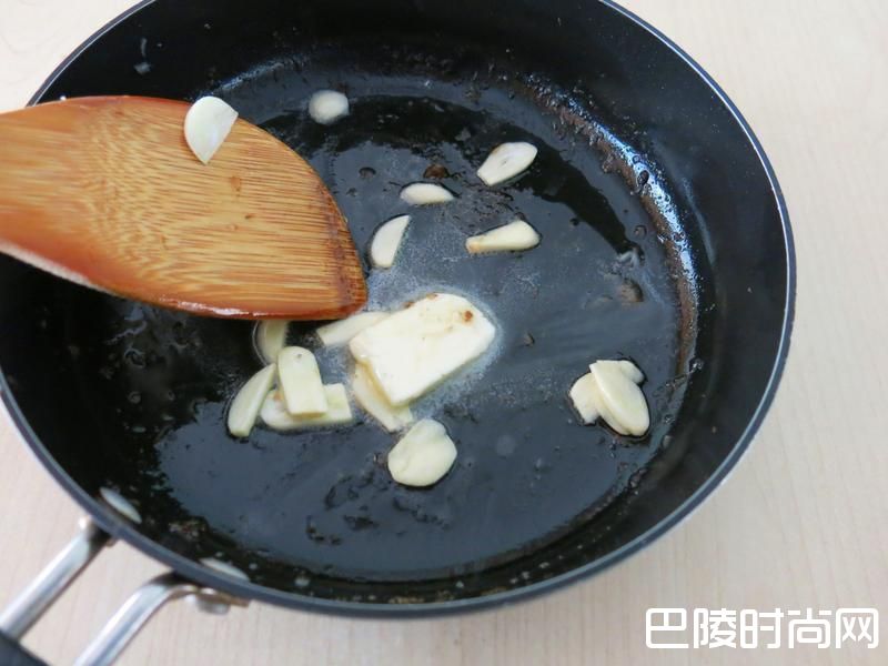 5利用剩下的油将蒜片煎至微焦出蒜香味。