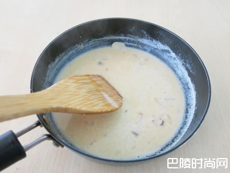 6倒入白酒后再加入牛奶熬煮至浓稠。
