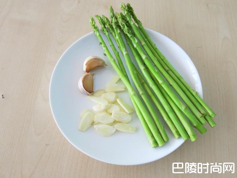 3绿芦笋洗净切成适当长度,放沸水烫1分钟捞出沥乾,大蒜去皮切片。