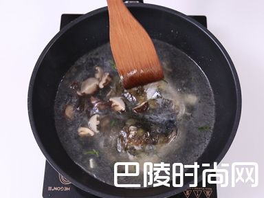6之后倒入鱼头,料酒,500mL水和香菇,加盖煮滚