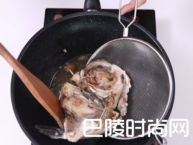 4在锅内加热适量油,放入鱼头炸至外表呈金黄色,每面约需时2-3分钟。取出吸干多余的油份,备用