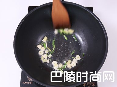 5在锅内再加热适量油,加入葱姜蒜炒香,约需时30秒