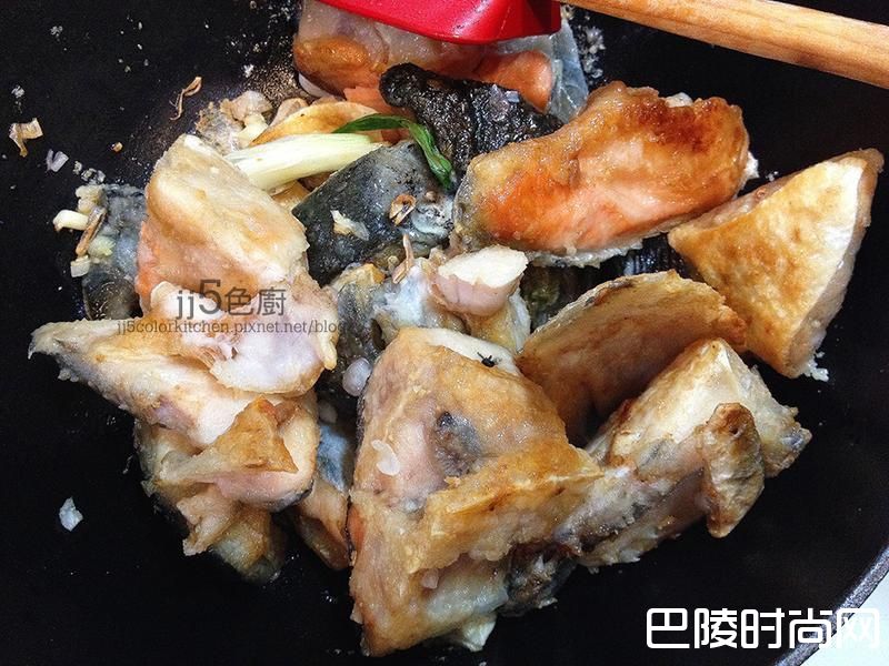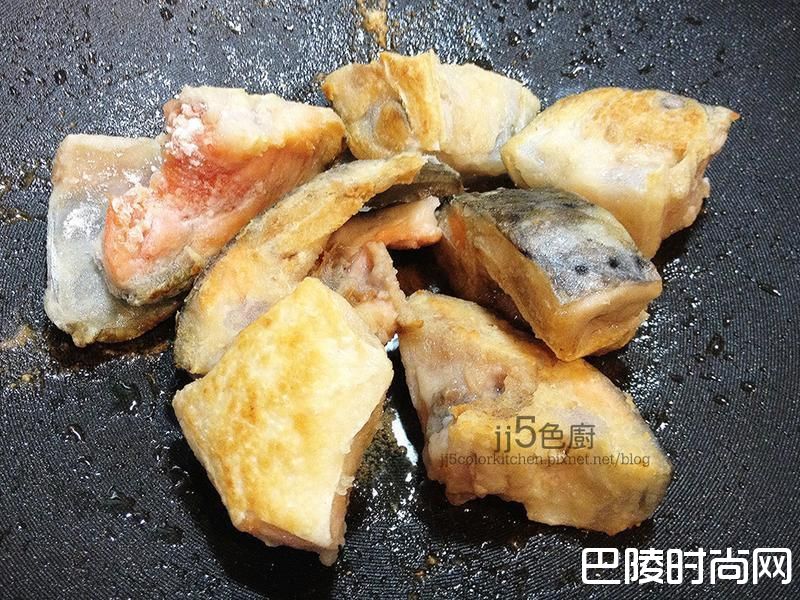 3鲑鱼头块均匀沾上面粉,炒锅下油,放一片姜爆香去腥,中小火煎鱼头至金黄色,各面都需煎到,取出备用。锅中的鱼油不要倒掉。