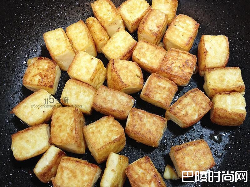 2鸡蛋豆腐切1.5cm丁。平底锅加油1/2汤匙,将鸡蛋豆腐煎至2面金黄(有时间可煎至4面或6面金黄!)
