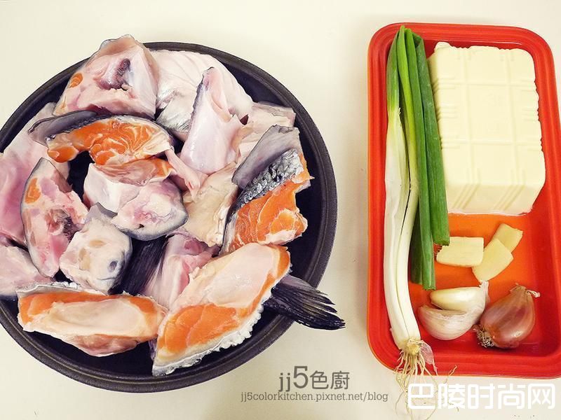 1鲑鱼头洗净,擦干水,加盐及胡椒粉放冰箱醃1小时。