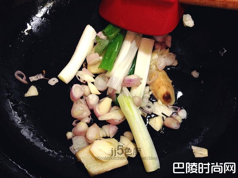 4原锅中火把辛香料(蒜头碎、姜2片、红葱头碎)爆香。葱留1茶匙葱花,其余切段加入爆香。