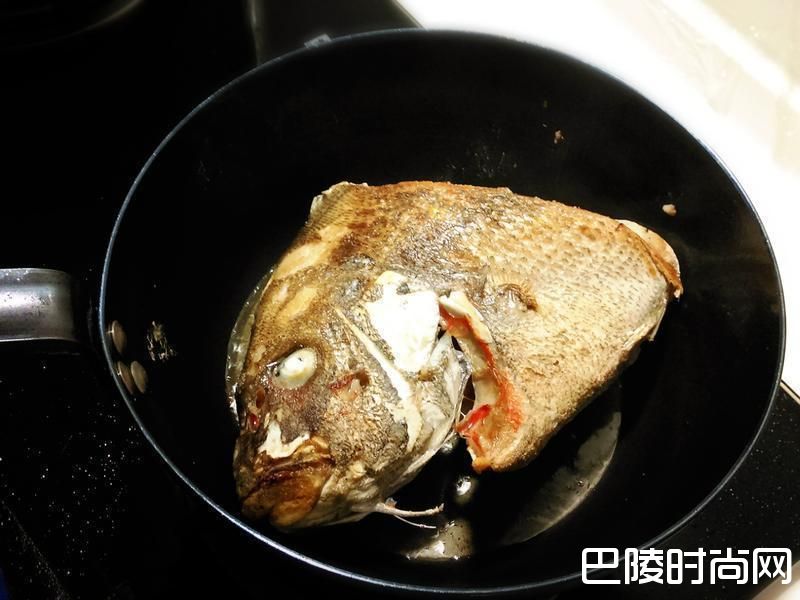 3把鱼头两面煎至金黄色,