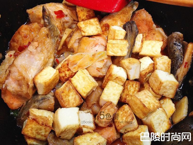 7酱汁烧热后加进鸡蛋豆腐丁。