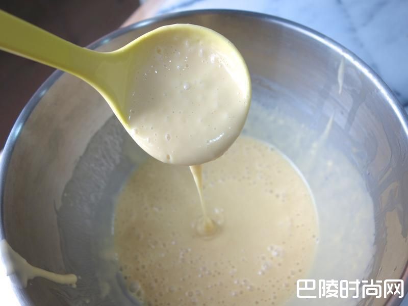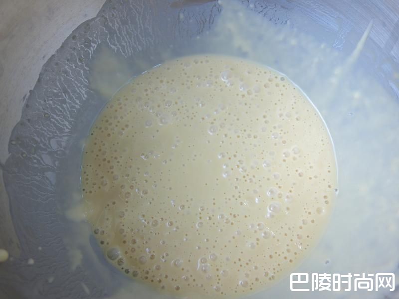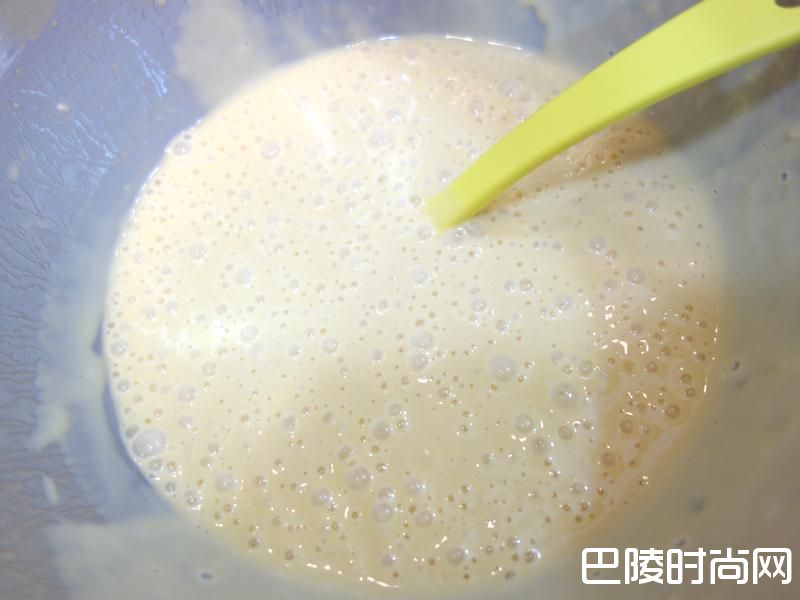 3盖上保鲜膜松弛+发酵时间 室温下: 30(夏天)~60(冬天)分钟.进冰箱前先用杓子搅拌面糊排出空气!