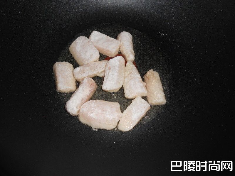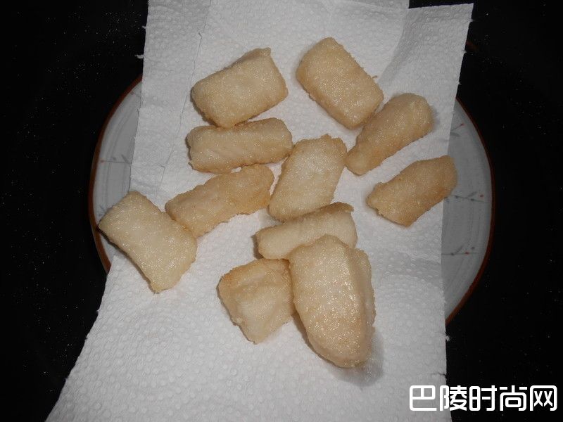 2先煎鱼柳条。鲷鱼片用手一片片放入地瓜粉袋子里,放入后抓紧袋口,将袋子甩斗一番,让袋子里的鱼肉均匀沾附干粉。不沾炒锅放3~4大匙油用小火热锅,趁热锅时把袋子剪开,油热好后用手把鱼片排入锅里(鱼片从袋子拿出时,要先在袋子上斗落多余干粉,再放入锅里半煎炸)。