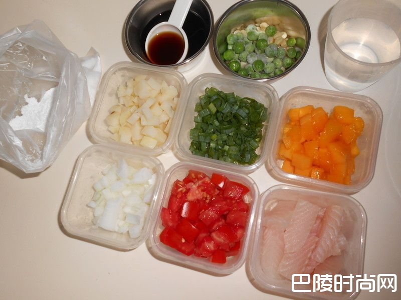 1 备料。塑胶袋装一些地瓜粉。酱汁先调成一碗。豌豆仁、玉米粒从冷冻库取出,使时前再用水冲洗一下。马铃薯是中午蒸的,整颗洗净、蒸25分钟取出放温、用水搓掉薯皮后再切丁。鲷鱼片逆纹拉斜片后切小块。其他材料