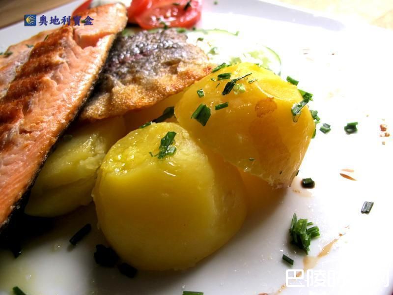 3马铃薯连皮放入煮沸的热水中,煮到可以用筷子轻松叉透。熄火,离火,留在热水中10分钟,捞出,去皮,切块,撒一点海盐和细香葱,就可盛盘。