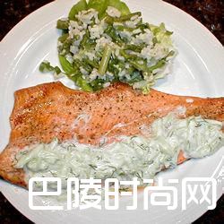 虹鳟鱼拌酸奶青瓜酱原味酸奶225克,青瓜1根,磨碎,新鲜莳萝2汤匙,切碎,柠檬皮碎1茶匙,纯橄榄油1汤匙,现磨黑胡椒和盐适量,虹鳟鱼排4块