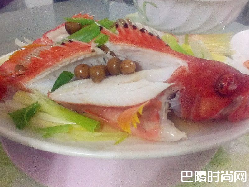 7蒸好将蒸盘取出,倒掉盘中的汤汁。将葱丝姜丝舖上鱼身,淋上树子(含汤汁)及米酒,放进蒸锅中以大火蒸2分钟即可
