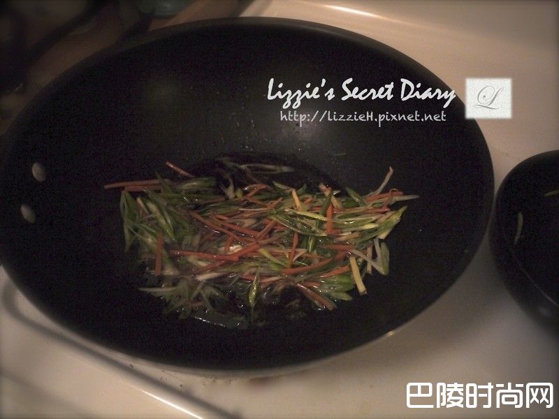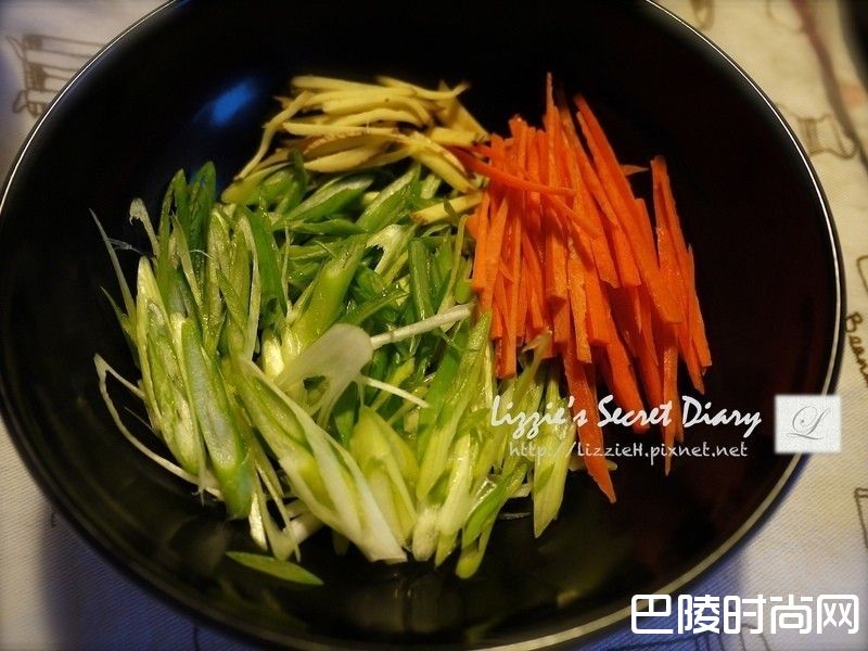 1备料! 将葱用斜刀切细丝; 姜切细丝; 红萝卜丝可依照喜好程度加或不加