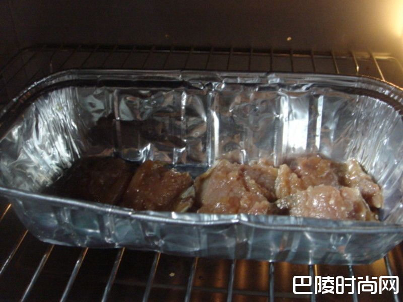 4烤箱以170度预热,取出烤架。醃好的秋刀鱼将鱼腹朝上,置于可重复使用之锡箔盒内并放上烤架,再将烤架放回烤箱内,烤10分钟。(爱护地球,请减量使用锡箔纸)