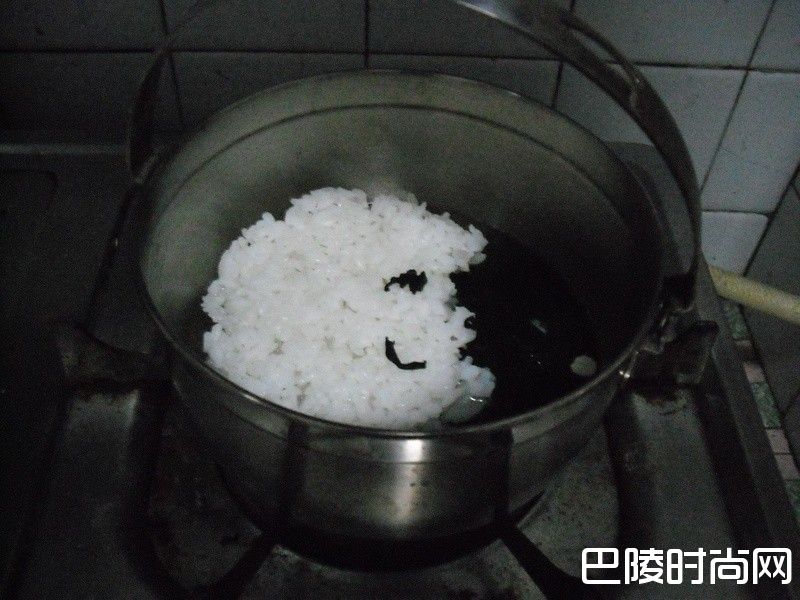 1此次是想要处理掉前一天没吃完的白饭,所以冰箱拿出冷饭后,添水加热。洒上一小撮的海带芽,爱吃海带可以多放一些。