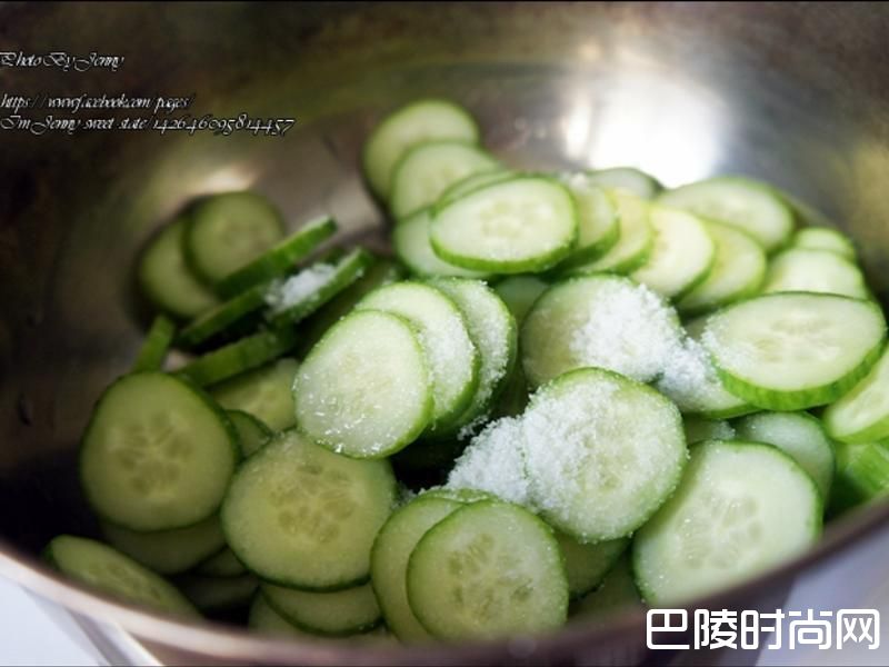 2加入盐巴抓拌去除小黄瓜本身苦水后 (约5分钟),再用冷水冲掉盐份并沥干水份。