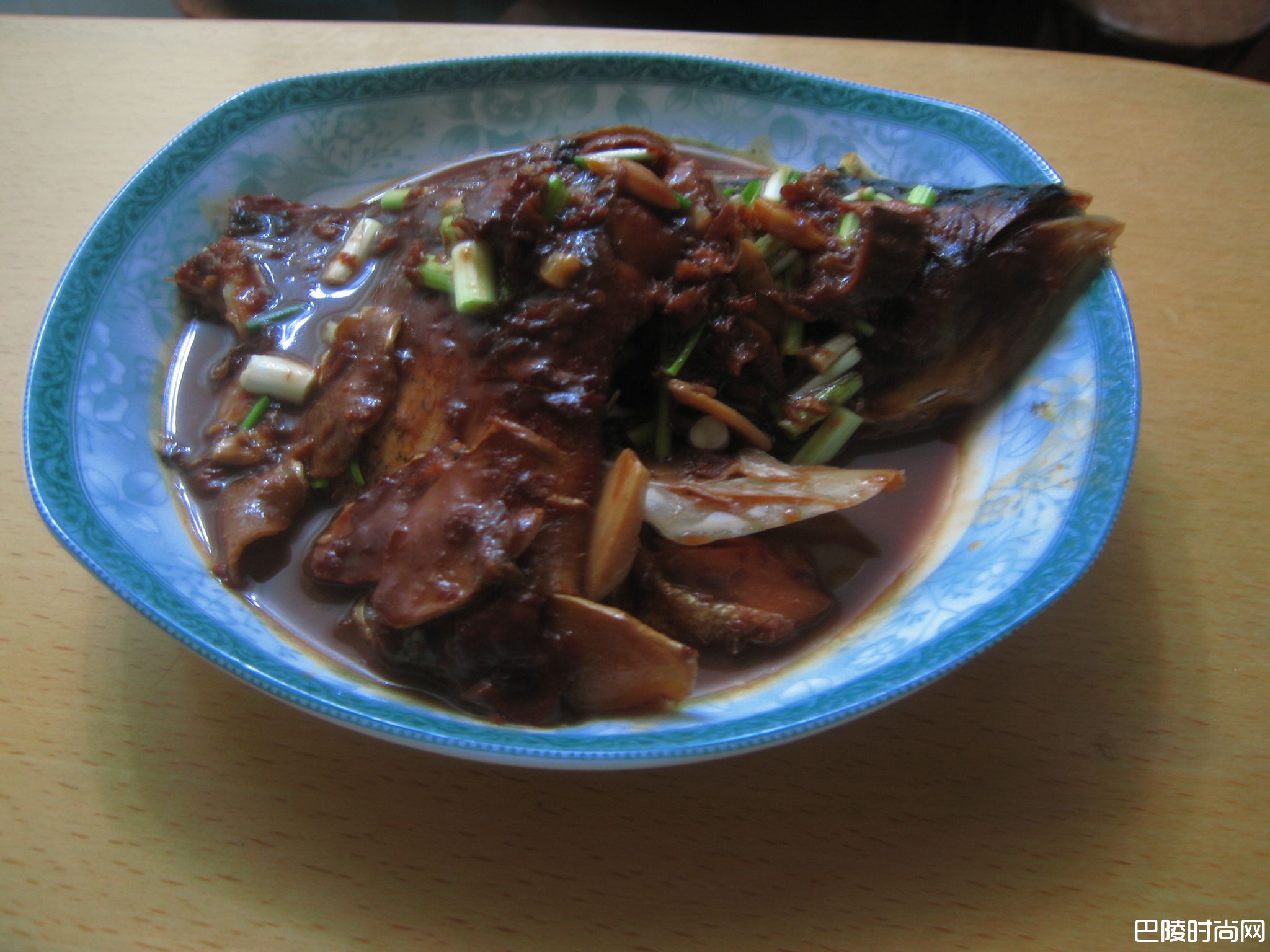 5.鱼熟开锅盖收干汤汁放入葱花即可装盘.
