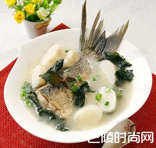 紫苏山药花鲢鱼尾汤花鲢鱼尾250g、山药300g、鲜紫苏叶20g、生姜15g、盐3/4茶匙、料酒2茶匙、胡椒粉1/4茶匙、味精1/4茶匙
