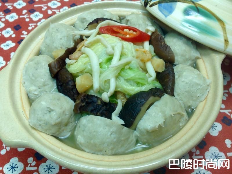 1爆香蒜片>香菇>金钩虾>干贝,炒软大白菜>木耳>美白菇>夙目鱼丸>辣椒(水酌量加)