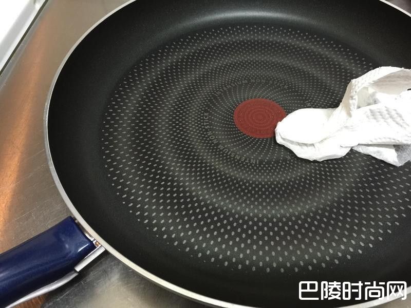 4起平底锅,中火热锅,滴一滴沙拉油,用厨房纸巾在锅面抹开