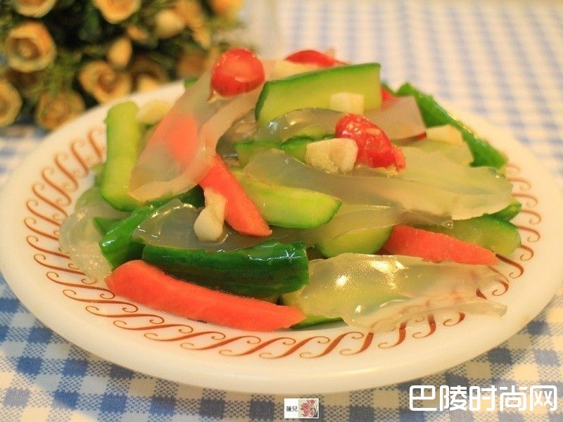 3小黄瓜用刀背拍。 会拍成4-5块,籽的部份也会跑出,籽的部份去掉不要。 红萝卜切小条状。放1小匙糖、1小匙盐拌均匀,醃渍20分钟。 20分钟后去掉已出来的糖盐水。