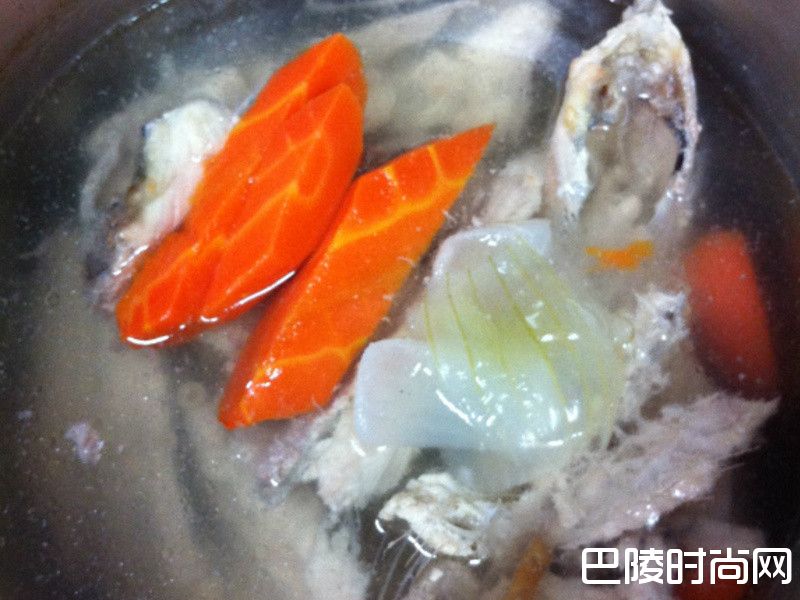 8滚水放入姜片.红萝卜.洋葱.处理干净的虱目鱼骨一同熬煮,用大火煮滚用器具捞油网,捞起多余的杂质......之后转中小火熬煮成高汤