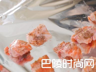 三文鱼骨切块,用盐、黑胡椒及五香粉腌15分钟