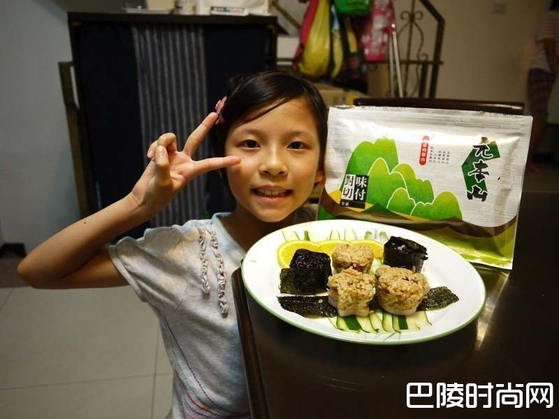 3将元本山味付对切海苔一张剪成3条,把刚刚的饭包卷起来