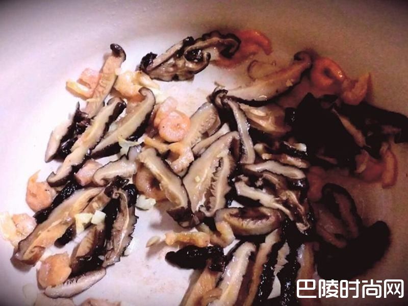 2热油锅依序爆香姜片、蒜末、香菇、虾米,炒至香味出来。