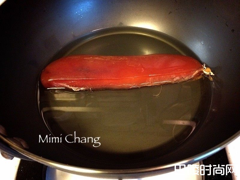 1乌鱼子去膜,放入平底锅,酒倒入刚好淹没乌鱼子的高度,中火煮至酒少一半,翻面煮干取出。