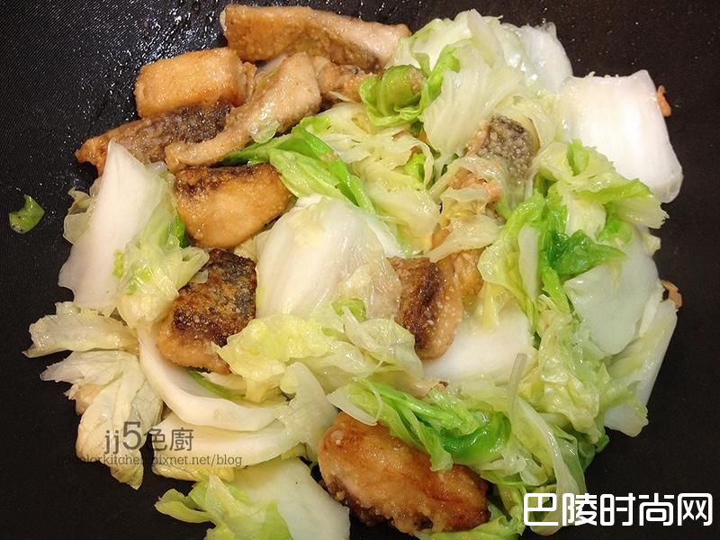7下白菜炒至有点变软,倒进鱼块轻轻翻炒,转中小火煮10-15分钟(视乎你喜欢的白菜软度)。白菜会出水变成汤汁,如觉得过乾,可加适量泡虾米水再煮。