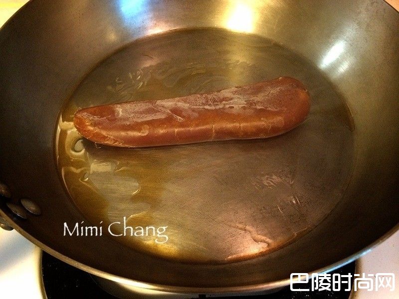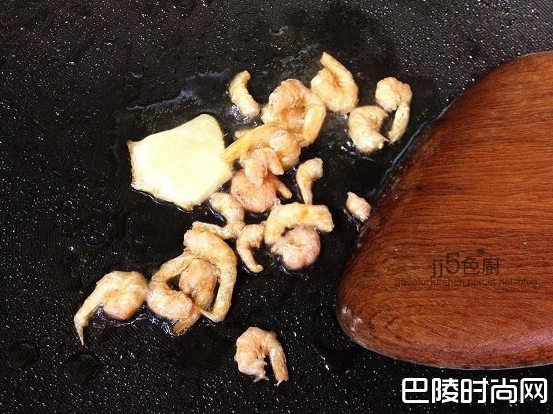 6炒锅下油, 中大火爆香姜片及虾米。泡虾米水不要倒掉,备用 。