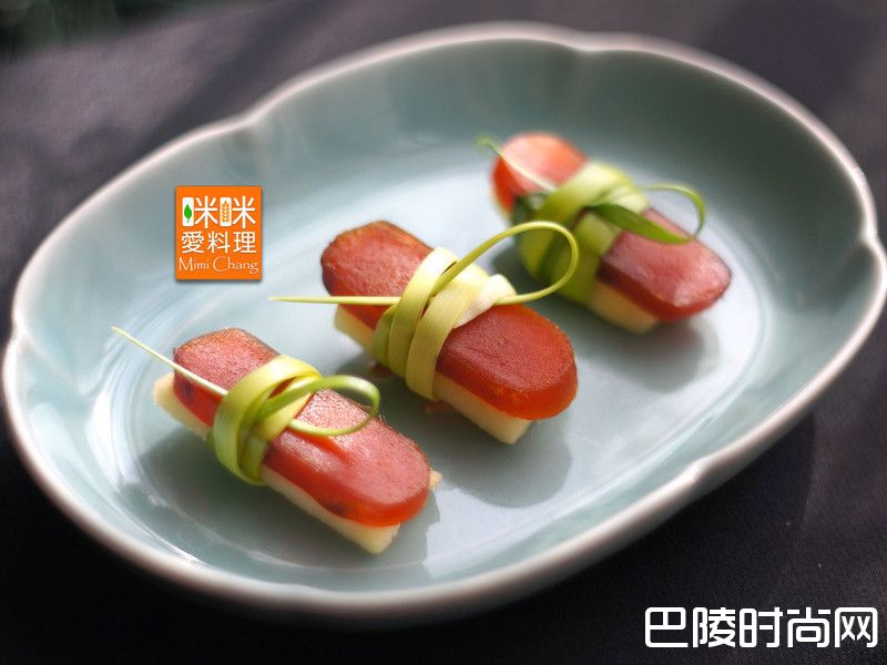 4选用大蒜内较细嫩的叶,将乌鱼子及苹果片绑起,完成。