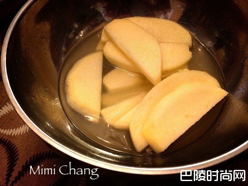 3将富士苹果切薄片,约0.4公分,切成长方形。苹果切开要保持不发黑,可以泡盐水或是柠檬汁,我是用柠檬汁。