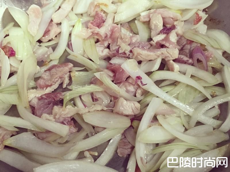 3接着将切丝的半颗洋葱、红葱头拍碎后下锅爆香。