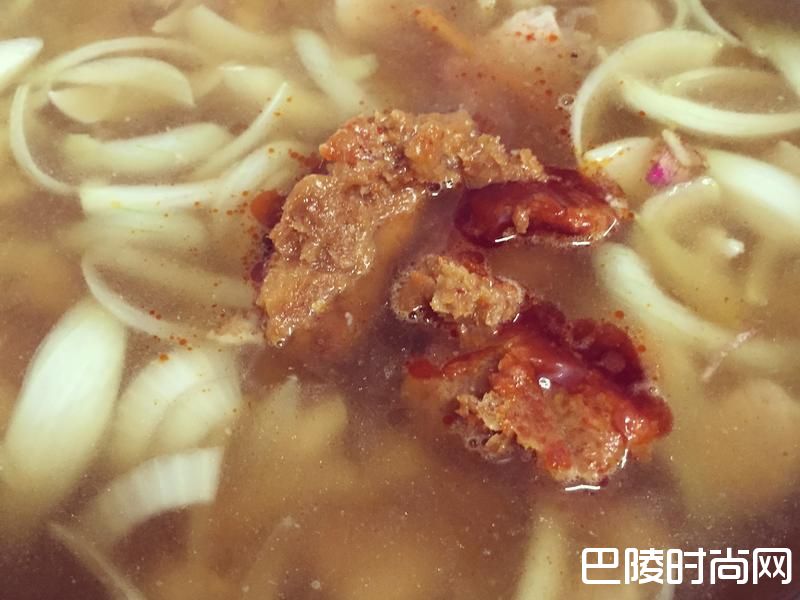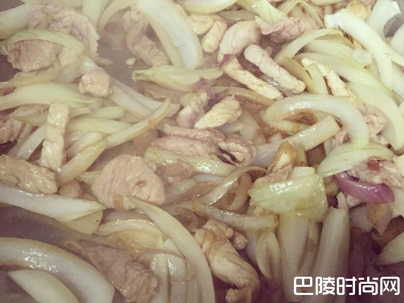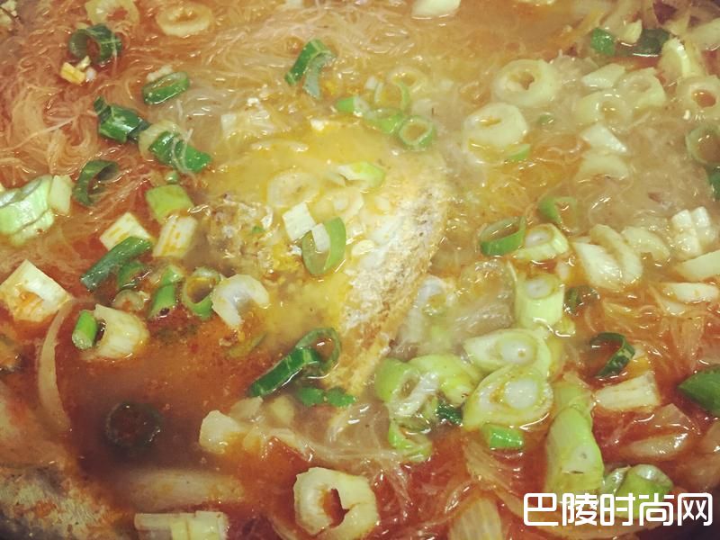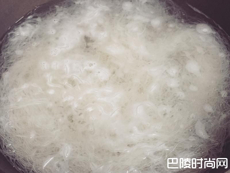 10接着将米粉移至酸辣汤头中,吸收汤汁。最后洒上蒜苗就可以起锅了。