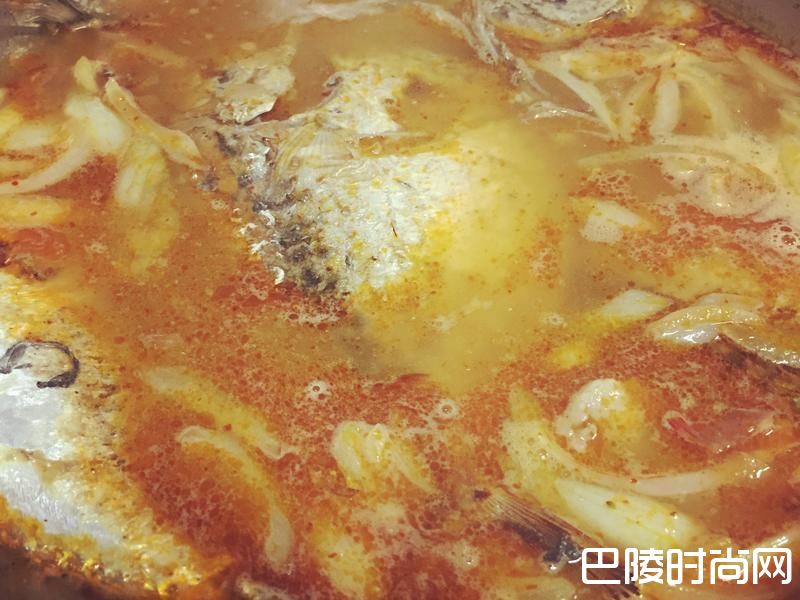 8待汤头小滚后将原先煎好的皮刀鱼放入。